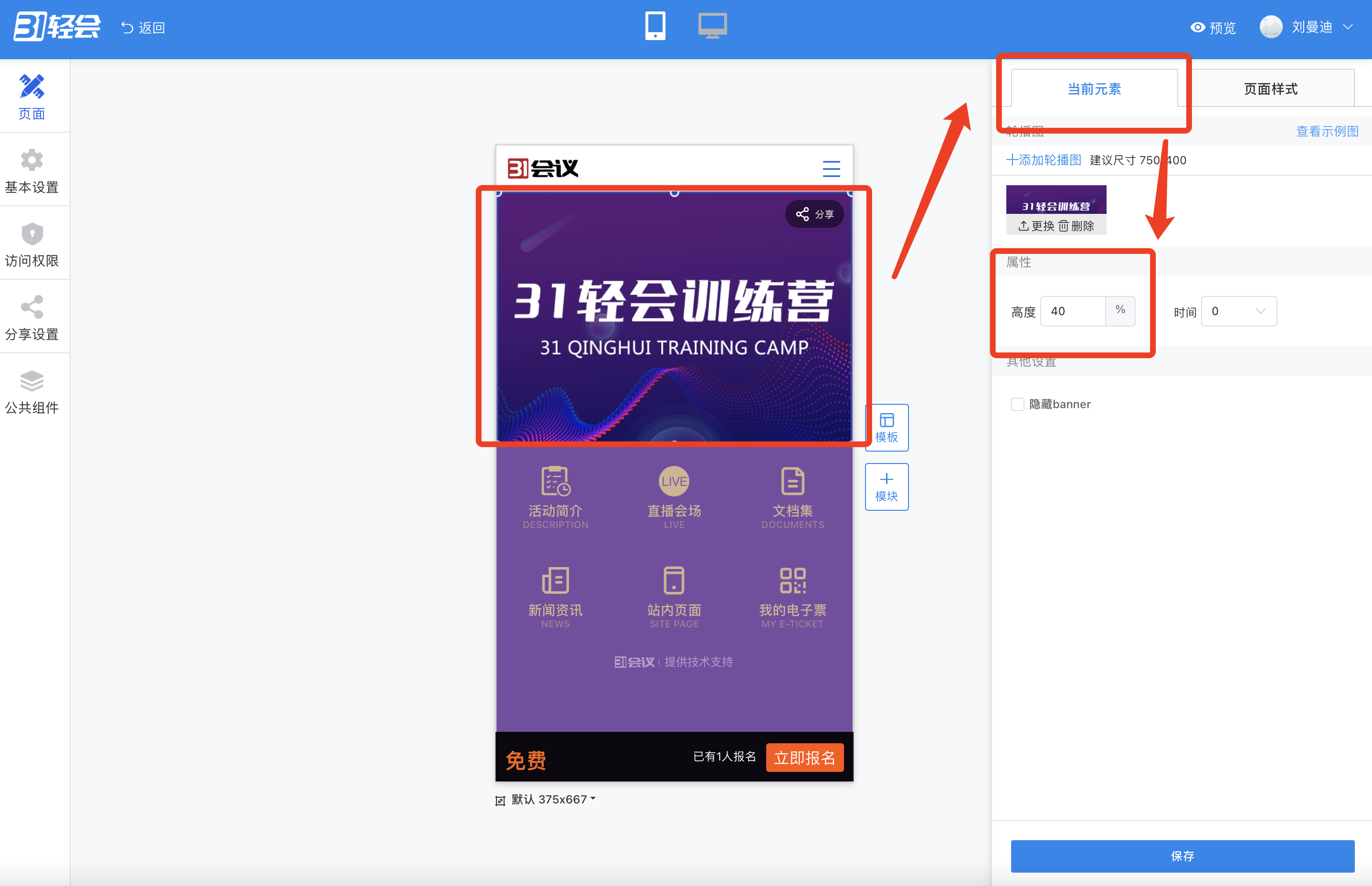 方法二:点击Banner区域,在【当前元素】中根据需要修改Banner区的高度